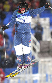 One of those went to Jennifer Heil in moguls. Ah, but looky here! Hannah Kearney (right) of Norwich, Vt. — Vermont, bitches! — beat out Heil to take U.S. America’s first super-duper shiny object. Two things about the moguls — (1) my knees hurt just watching that, and (2) you can’t tell the difference between one run and another. In that regard, it’s like figure skating without spandex, and with more stoners.