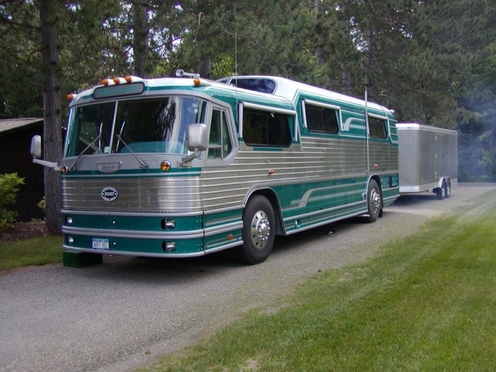 1955 VL100 Flxible Bus Conversion Conversion done in 1989. Solid oak cabinetry throughout. Repowered with a Detroit Diesel 6V92, 350 HP with Allison 5 speed automatic transmission. 4 year old torsilastic suspension 100 gallon fresh water tank, 80 gallon septic, 10 gallon hot water heater. 7kw Kohler diesel generator All electrical appliances … refrigerator, 4 burner cook top, microwave, 15,000 Btu roof air conditioner 2 under floor A/C units New Flexsteel ultra leather electric captain’s chairs New Flexsteel chair (rocker/recliner) and couch (couch opens for additional sleeping) Laminate flooring in isles accented with carpeting. Rear bedroom features a queen size center walk around bed with under bed storage. Walk through bathroom closes off both sides for privacy. Commode, sink and full tiled shower and tiled bathroom floor. AM/FM satellite radio Rear backing monitor This beautiful 35 ft coach is fully equipped for comfortable camping or extended vacation tour.