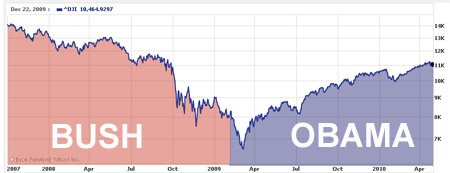 This first is a chart of the stock market as it performed in the last two years of the Bush Administration and the first two years of the Obama administration. Surely right-wing bloviator Lawwy Kudlow had it right when he opined: