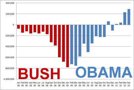 This is a chart of job losses under Bush (in red) and under Obama (in blue). If contra Larry Kudlow the performance of the stock market isn’t your favorite metric of the effectiveness of a president’s economic stewardship, you can always choose to go by employment figures instead. And once again, the differences in performance between Bush and Obama could not be more stark. The Bush administration put a knife into the gut of the American worker and twisted it. Barack Obama has spent the last two years easing that knife out. Some have complained that he might have pulled the knife out faster. Of course, that ignores the nearly unanimous, un-constructive and hypocritical obstructionism coming from the political opposition doing their best to force the knife in deeper. In any case, recent employment figures do seem to show that the hapless victim of Bush administration policies (and by this I mean you and me) is showing clear and unmistakable signs of recovery.
