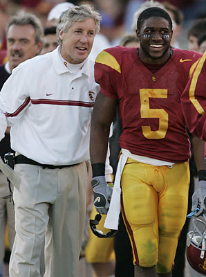 Of course, Pete Carroll (l., with Reggie Bush) won’t be around for the downfall, in that he is now coaching the Seattle Seahawks. He bravely hit the silk after last year’s disastrous season (complete with spanking at hands of Tree).