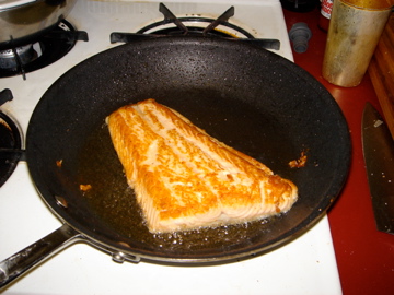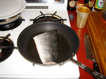 Skin side down – you can cook the fish ahead as well as it’s got to cool before you put it on the salad.
