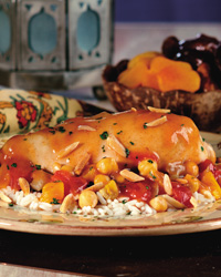 Remove all but 2 tablespoons of the oil from the pan then add the olive oil and heat over medium heat. Add the onions and cook until soft. Add the garlic and cook for 30 seconds. Add the ras al-hanut and cook another 30 seconds. Add the saffron with the soaking liquid, cinnamon stick, tomatoes, chickpeas, and apricots and bring to a simmer. Nestle the chicken into the mixture and bring to a simmer. Cover and cook on the stovetop or in the oven for 35 to 40 minutes or until the chicken is tender. Do not remove the lid to check on the chicken until this time. Garnish each serving with a dollop of Harissa Sauce, parsley and cilantro.