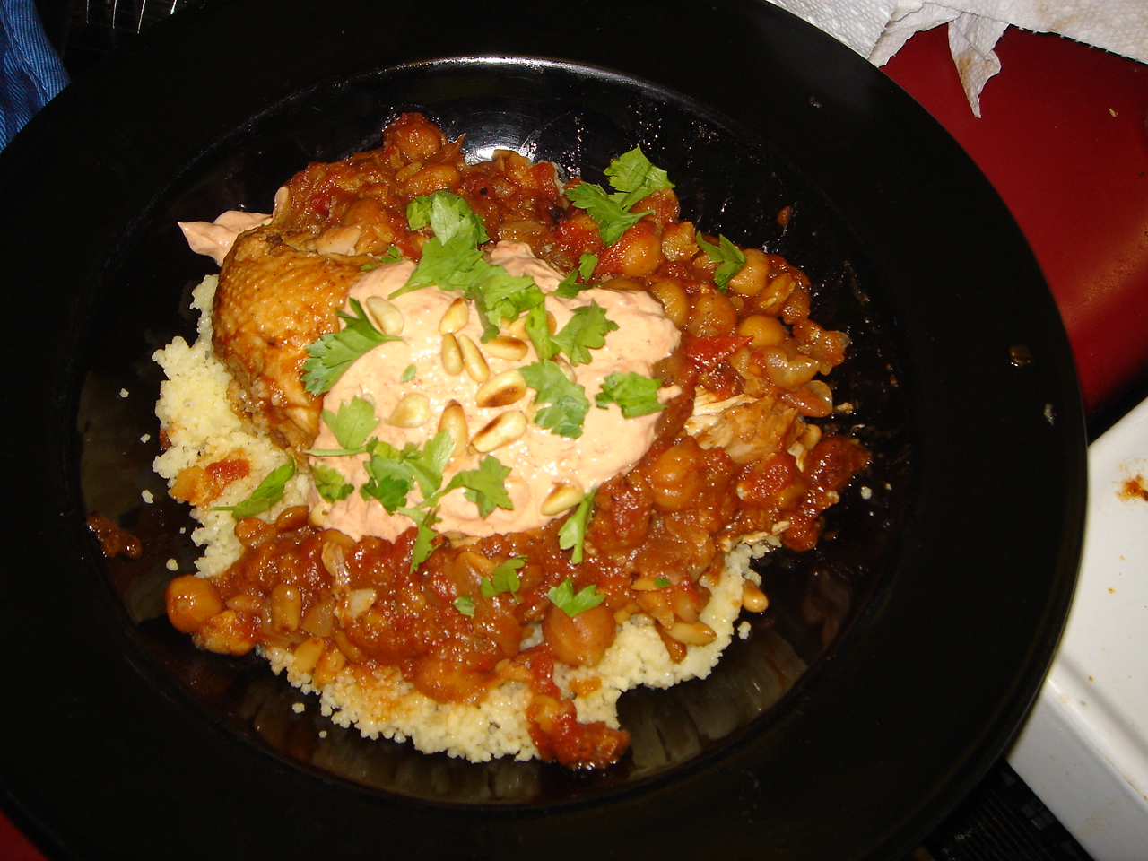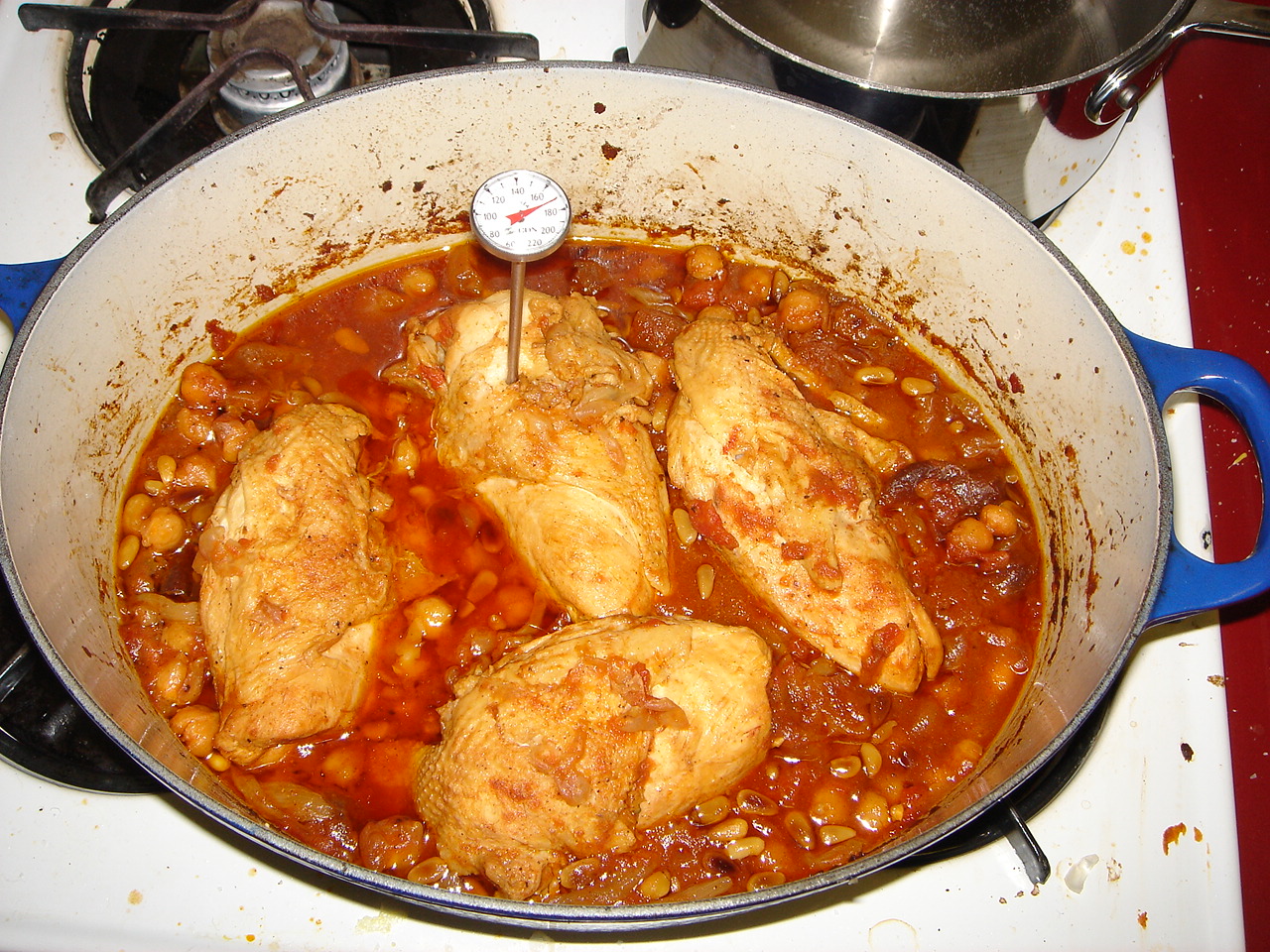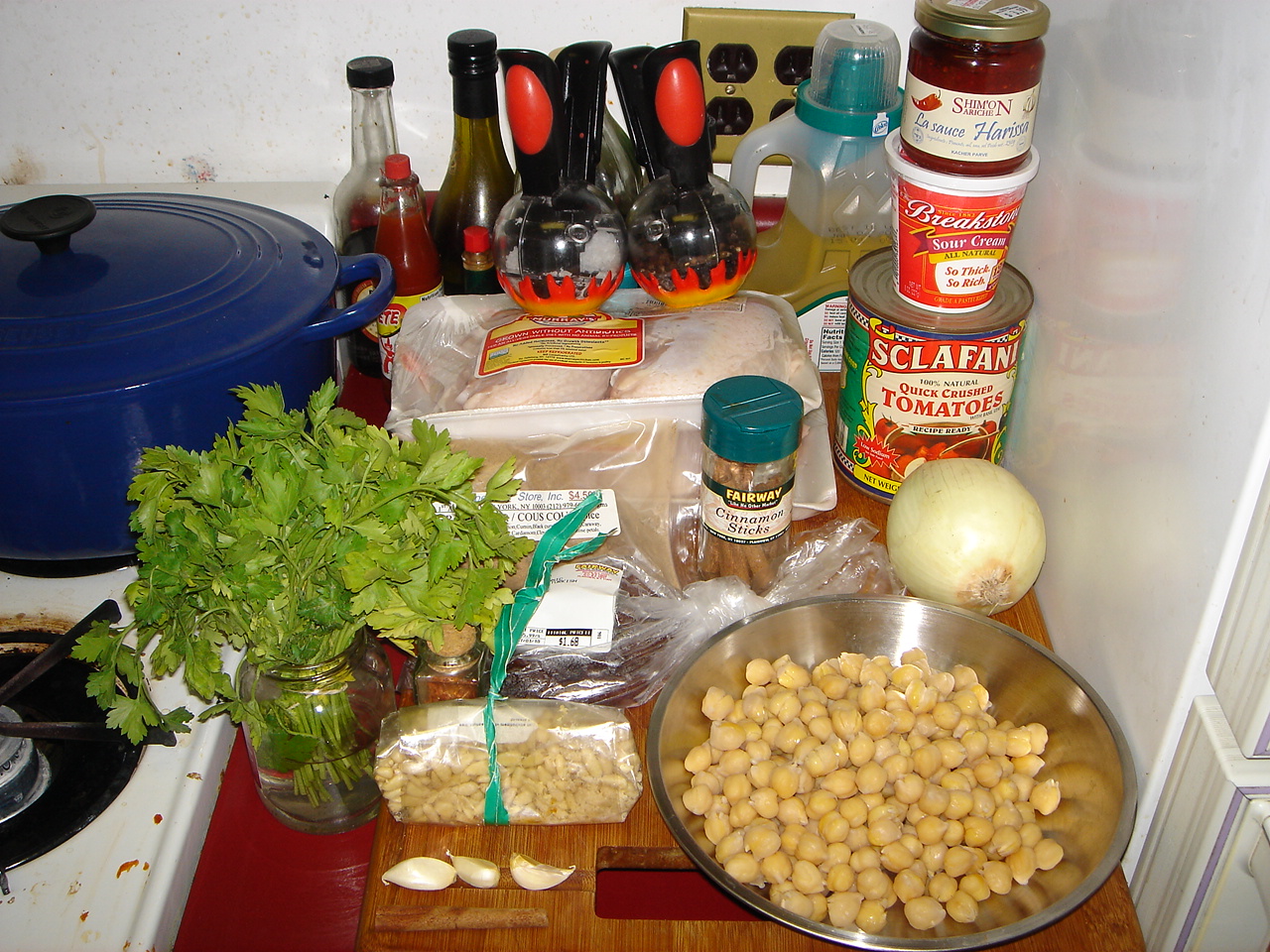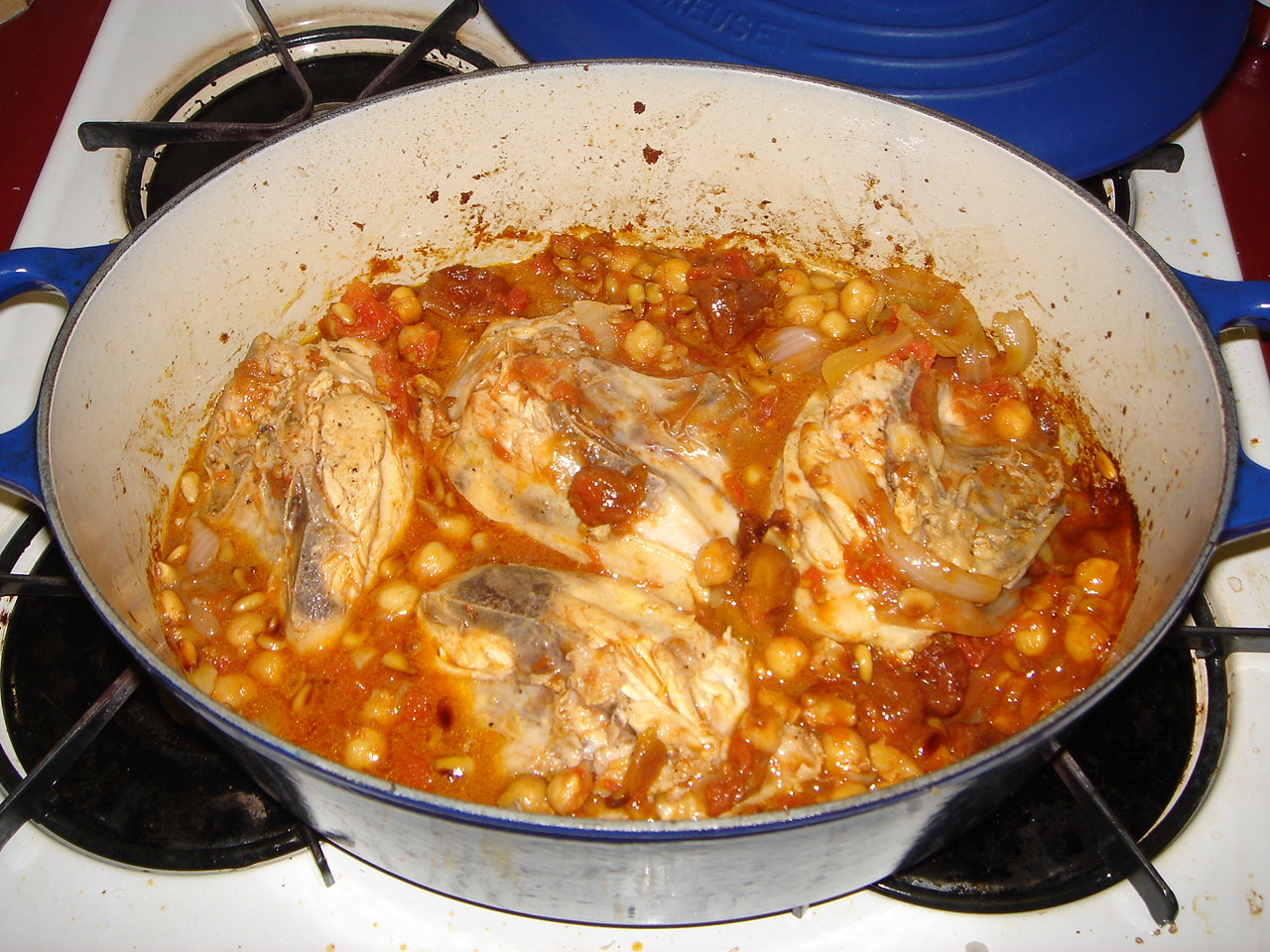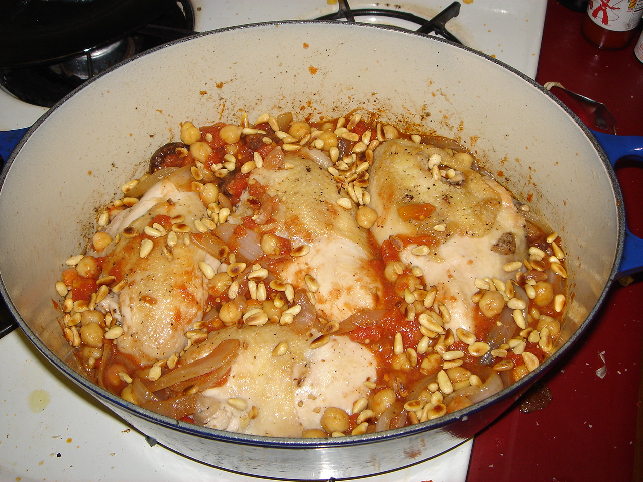 @pinkoscum: Level of difficulty = not too bad, and the result was unbelievably delicious, due in no small part to the ras al-hanut. I should have said – I used only 4 chicken breasts but made a full batch of the other stuff, which I wanted. The chicken was amazingly tender – granted, I started off with free range chicken that’s more expensive, but still. I urge you to try this.