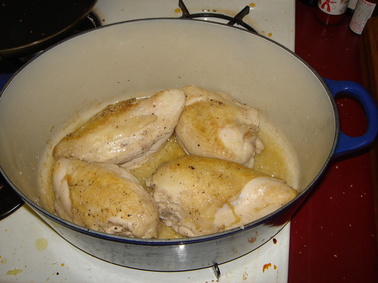 Then four chicken breasts go into canola oil:
