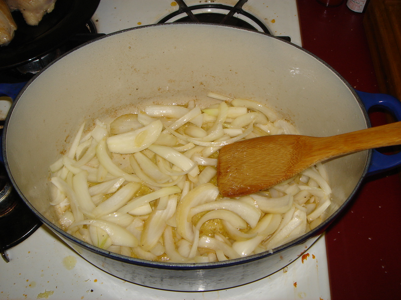 Then chicken out, and onions and garlic in: