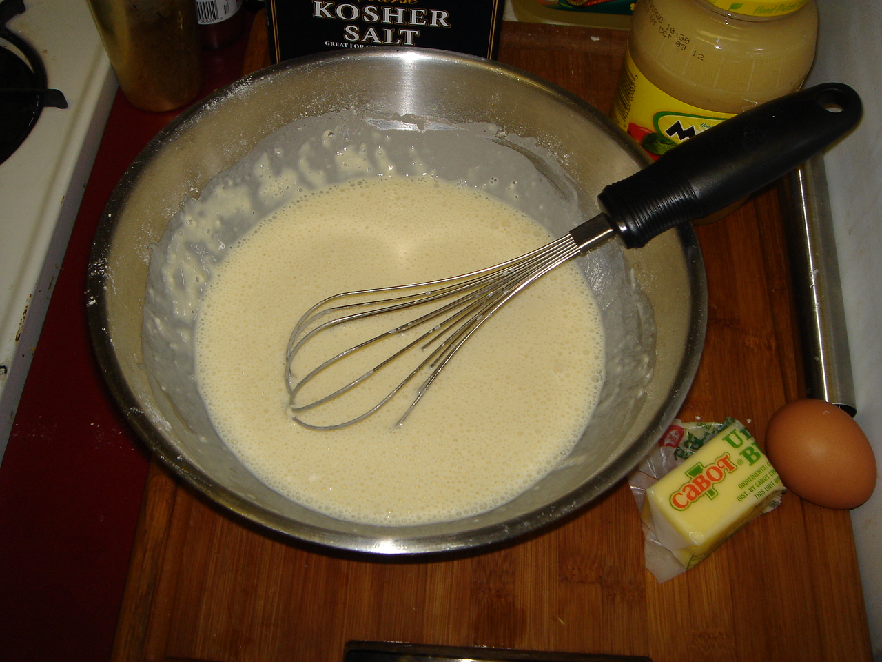 Beat eggs well and add salt. Add flour slowly and beat it in. Add milk gradually and beat to a smooth batter. This will make a very thin batter, but it works.