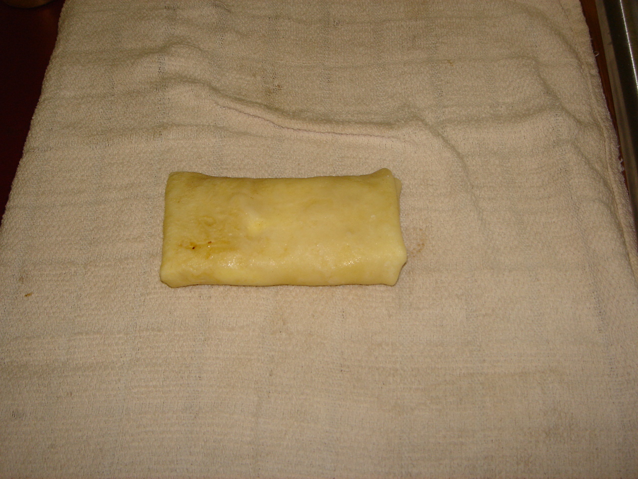 If you have the tab of dough produced by pouring out the excess batter, put it at the top, and use it as a sort of tuck-in piece when you make the first fold: