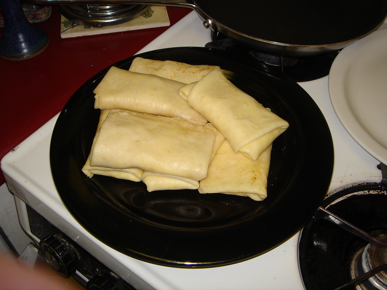 My friend Michelle gave me her extra crepe pan (you want something 7 to 8 inches diameter at the bottom) so I’m using that. Lightly butter the pan, add batter, then my grandmother’s trick was to pour the excess back into the raw batter after a few seconds – this makes a nice, thin crepe.