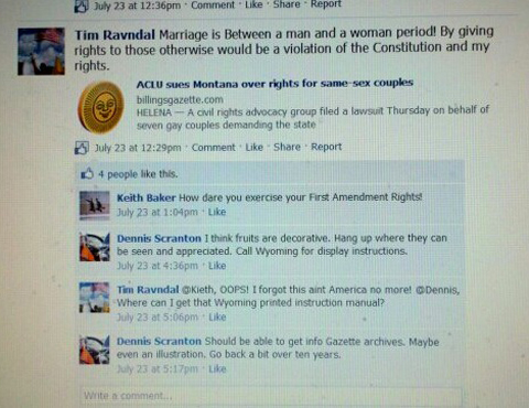 Ravndal had stated in a Facebook post that marriage should be between a man and woman (blah blah blah) and one of his fans commented, “I think fruits are decorative. Hang up where they can be seen and appreciated. Call Wyoming for display instructions.”