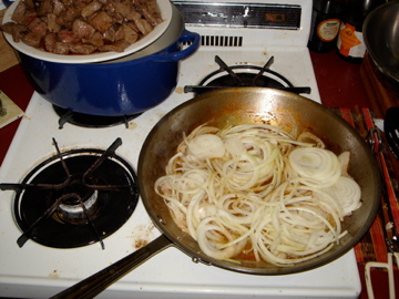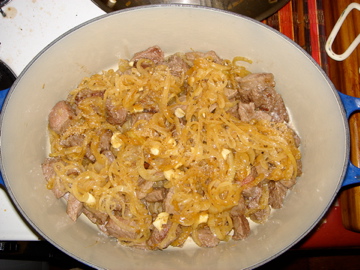 Preheat oven to 325 degrees. Cut the beef into slices about 2×4 inches across and 1/2 inch thick. Dry in paper towels, and put 1/16 inch layer of fat or oil into heavy-bottomed skillet. Heat until almost smoking, and brown beef slices quickly then set aside. I cooked the beef in 3 batches.