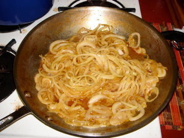 Fry the onions in the same fat, adding more fat if necessary. I had to do the onions in 2 batches – they reduced by about two-thirds.