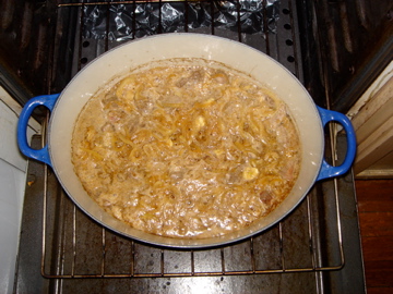 Bring casserole to the simmer on top of the stove, then cover and place in the lower third of the oven. Regulate the heat so the liquid remains at a slow simmer – cook for 2.5 to 3 hours until meat is fork tender. Here’s what it looks like about halfway through (I pulled it out to turn it and check for seasoning).