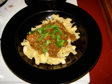 Ten minutes after 7 EST, and I think I’ll lower the heat and give it another hour. Rest of the recipe will follow – basically it’s straining the liquid, adding the cornstarch/wine vinegar thickener, pouring it over the meat, and serving the whole thing over egg noodles with a side salad.