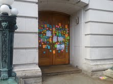 But these weren’t the only signs tacked up to the building. During the lockout last week (ending in the arrestless evacuation on Thursday night), there were hundreds of post-it notes tacked to the doors of the East Wing (where Walker’s office is). Some of them were not for family audiences (something about Walker and goats on one), some of them were downright ranty (like some approximation of the 95 Theses), but most were just short and to the point pleas from the unwashed masses. Touching, in many respects.