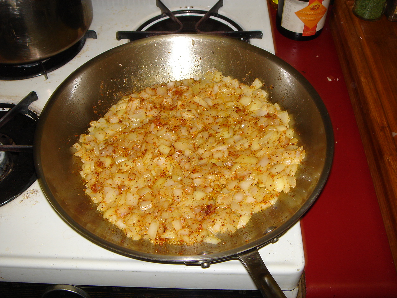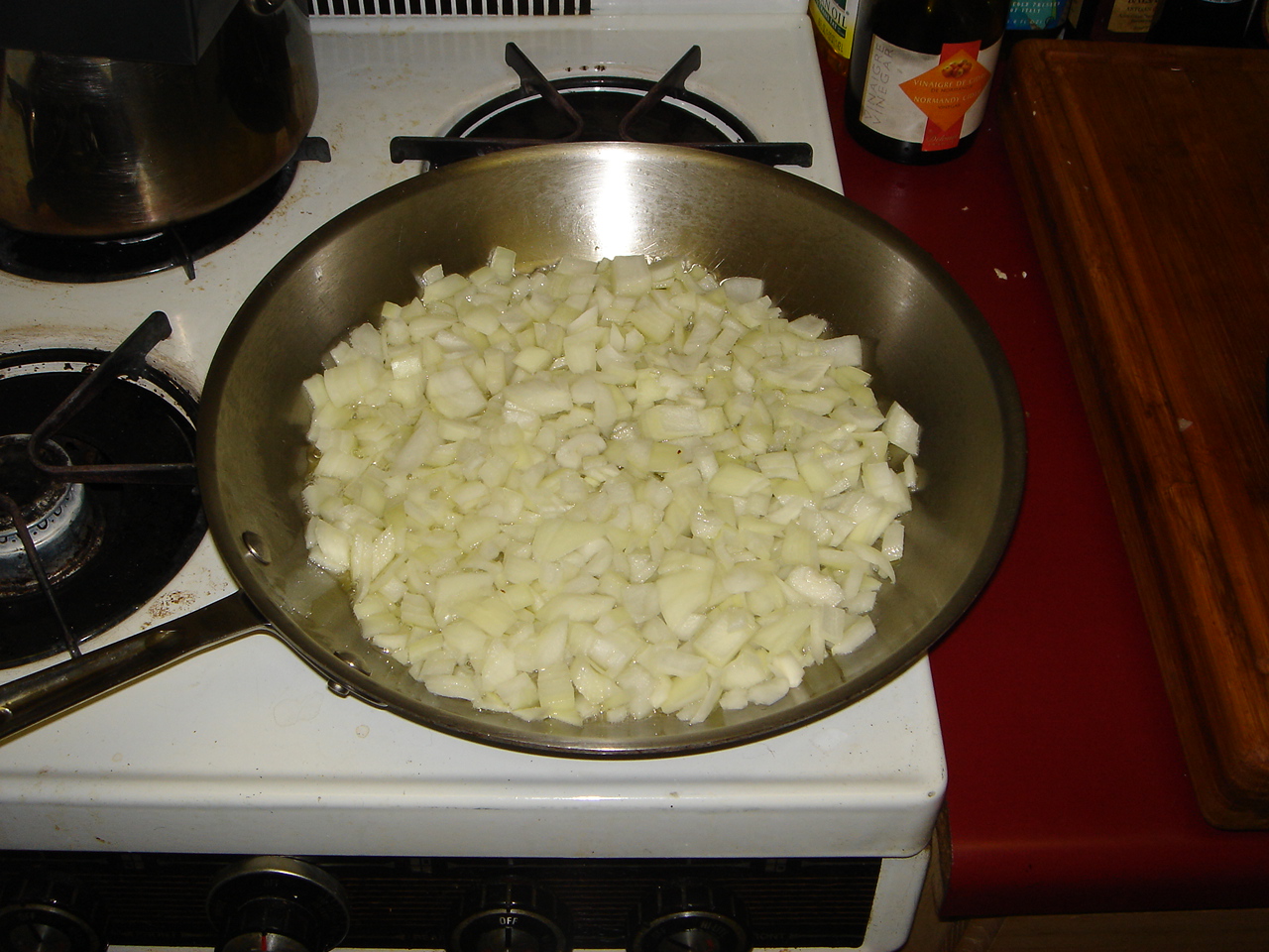 There are about 436.3o4 recipes for enchiladas on the internet, so I made up my own after reading most of them. First, dice a medium yellow onion and fry in canola oil until close to translucent: