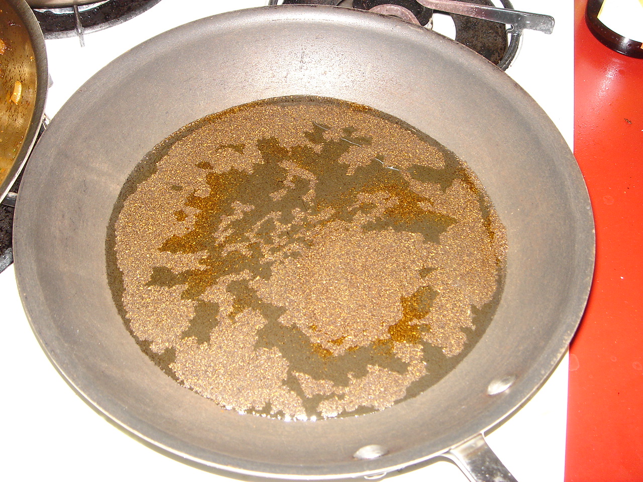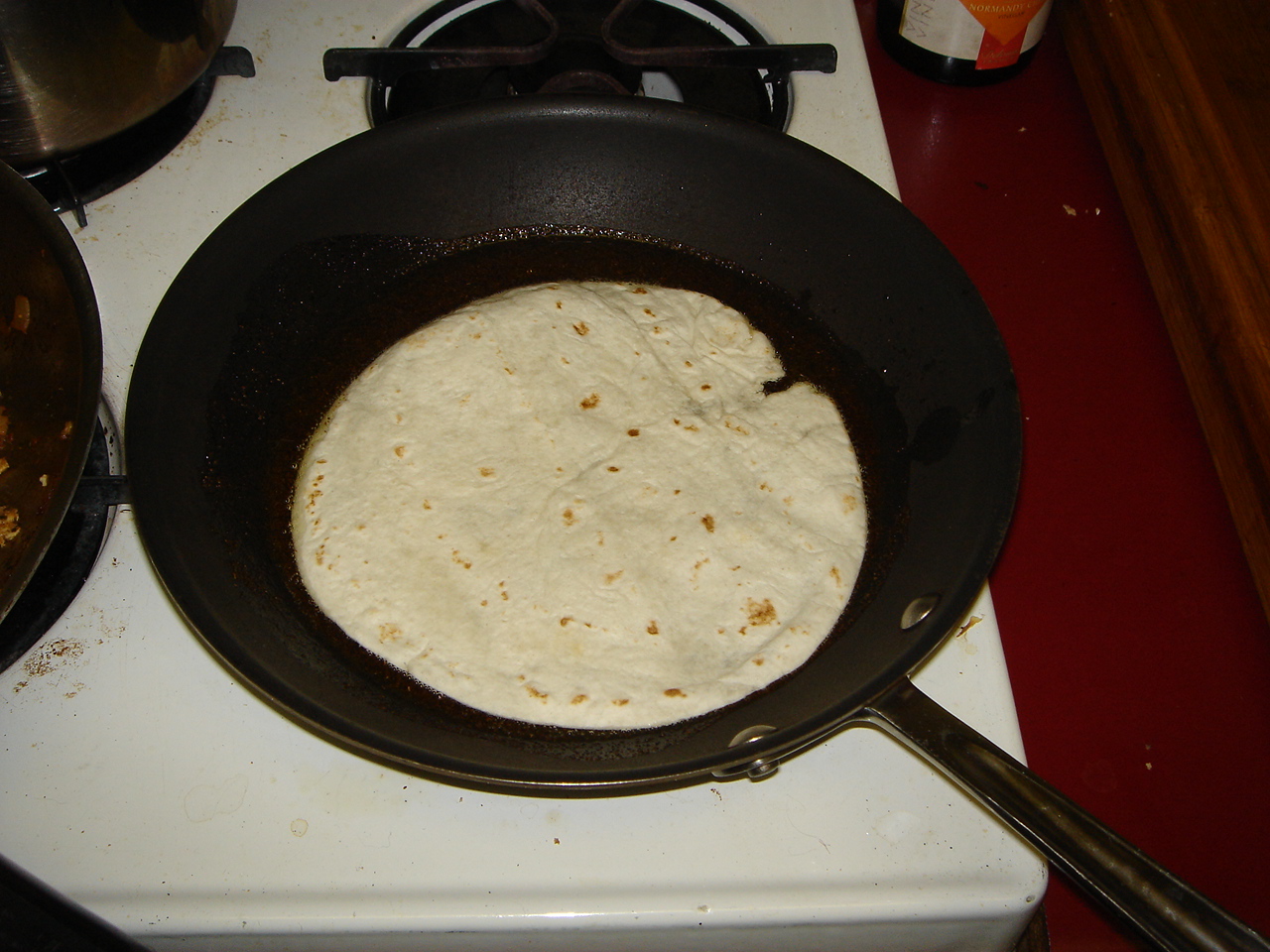 Filling done, so time to prep the tortillas – canola oil and a half teaspoon of chili powder to quick fry them:
