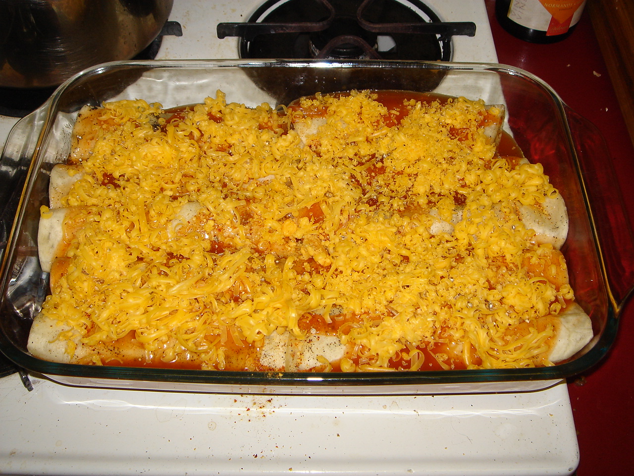 topped with a can of enchilada sauce (Old El Paso, natch) and a cup of NYS cheddar cheese (also natch), bit of salt and white pepper on top:
