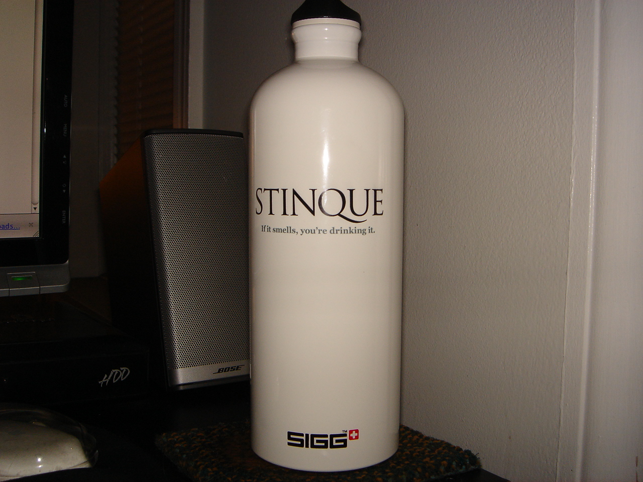 So I ordered the Stinque water bottle (made in Switzerland!) and it’s here! And it’s quality gear! And what does it say?